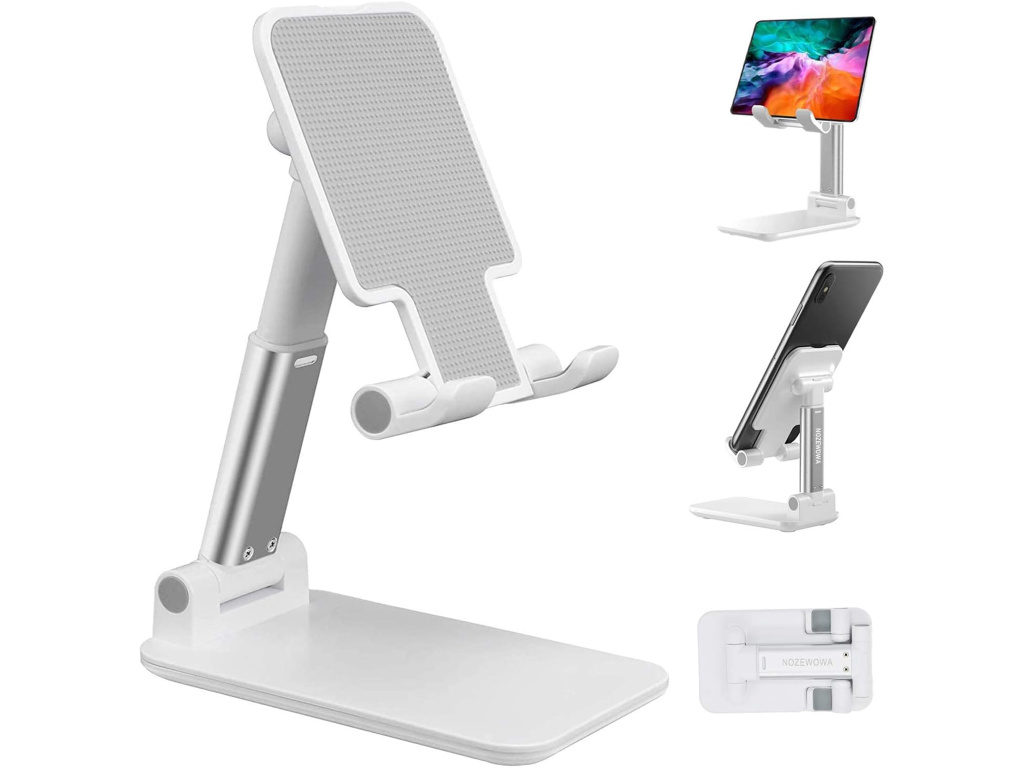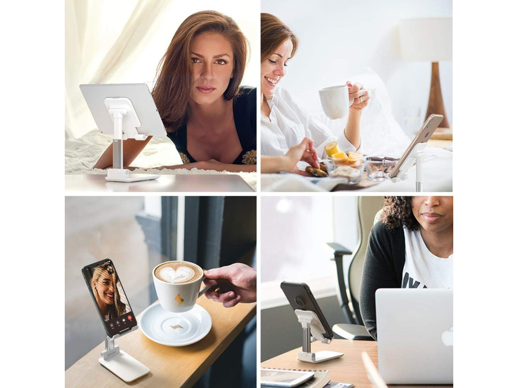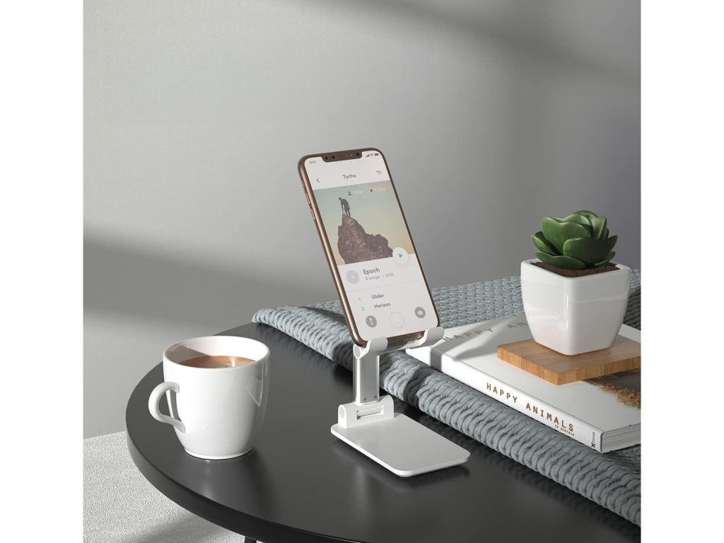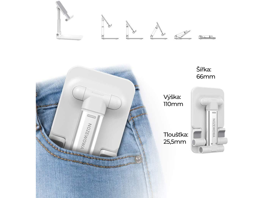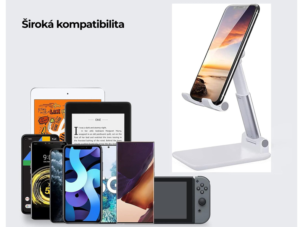 Stolní držák na smartphone s univerzální kompatibilitou podporuje mobilní telefony, tablety a e-čtečky o velikosti 4–8". Nastavitelná výška (8,4–15,5 cm) a otočný mechanismus umožňují optimální pozorovací úhel, což přispívá ke zdravému držení těla a snižuje namáhání krku. Robustní konstrukce z hliníkové slitiny s protiskluzovým silikonovým povrchem zajišťuje stabilitu a ochranu zařízení. Díky skládacímu designu a nízké hmotnosti je držák snadno přenosný a ideální pro domácí i kancelářské použití. Praktický otvor pro nabíjení umožňuje sledování obsahu i během dobíjení.