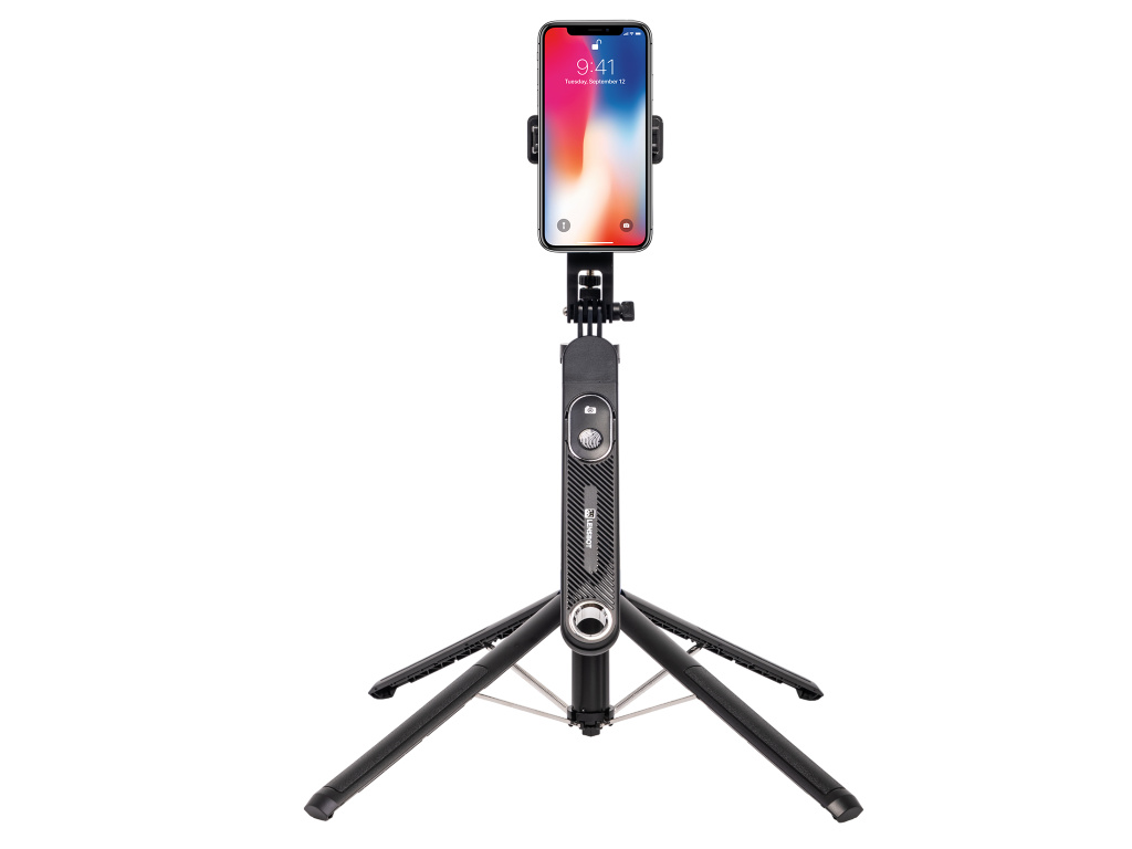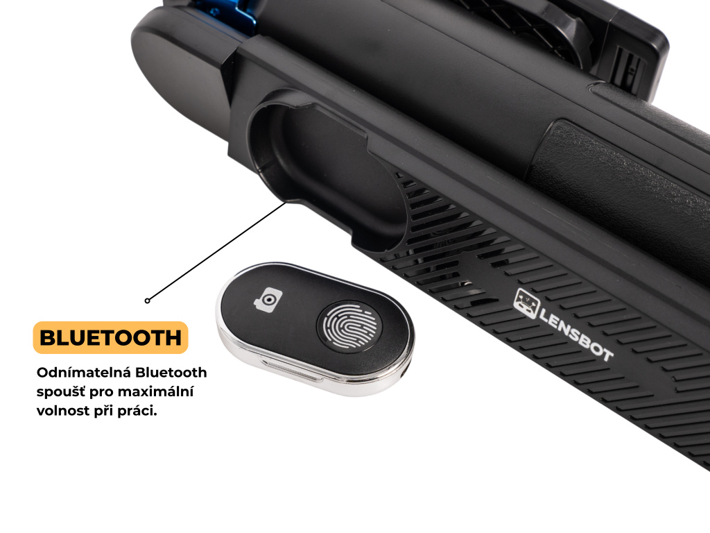 Součástí je odnímatelná Bluetooth spoušť (dosah až 10 m), ideální pro skupinové fotky, videa nebo samostatné natáčení bez dotyku telefonu.