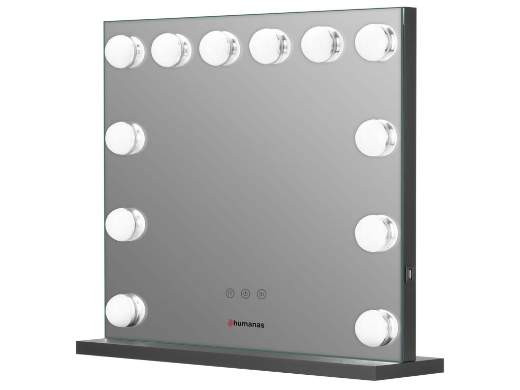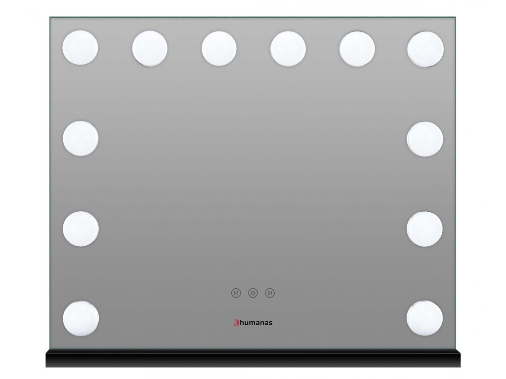 Velké obdélníkové zrcadlo Humanas je vybaveno 12 energeticky úspornými LED diodami, zrcadlo je nutností pro ty, kterým záleží na precizních světelných podmínkách, nezbytných při nanášení make-upu nebo líčení. Tento jedinečný design lze s úspěchem využít jak doma, tak v profesionálních kosmetických salonech, nejen jako pracovní nástroj, ale také jako designový prvek moderního prostoru. Zrcadlo je vybaveno dotykovým panelem, který umožňuje rychlé a pohodlné nastavení výkonu.