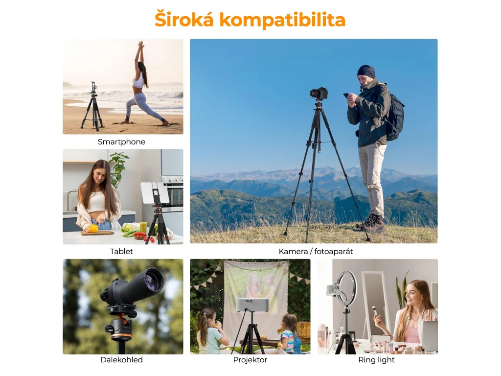 Stativ ideální pro fotoaparáty, lehčí kamery, ale díky dodávánému držáku i pro smartphone. Celková nosnost stativu je až 5kg a max. výška je až 145cm