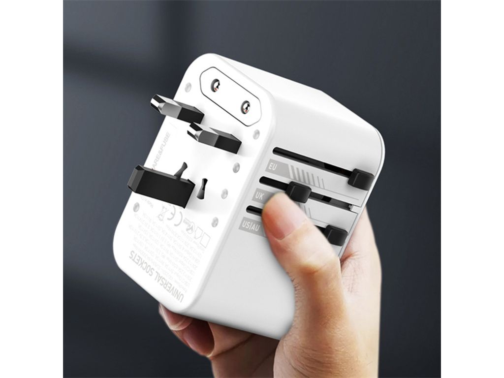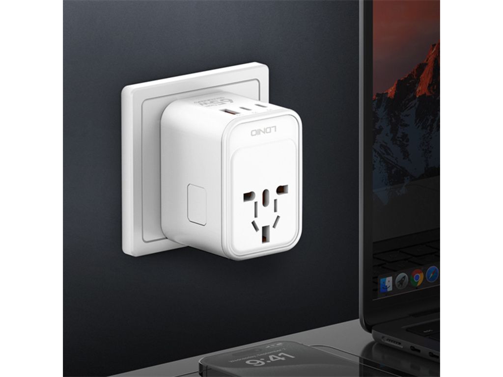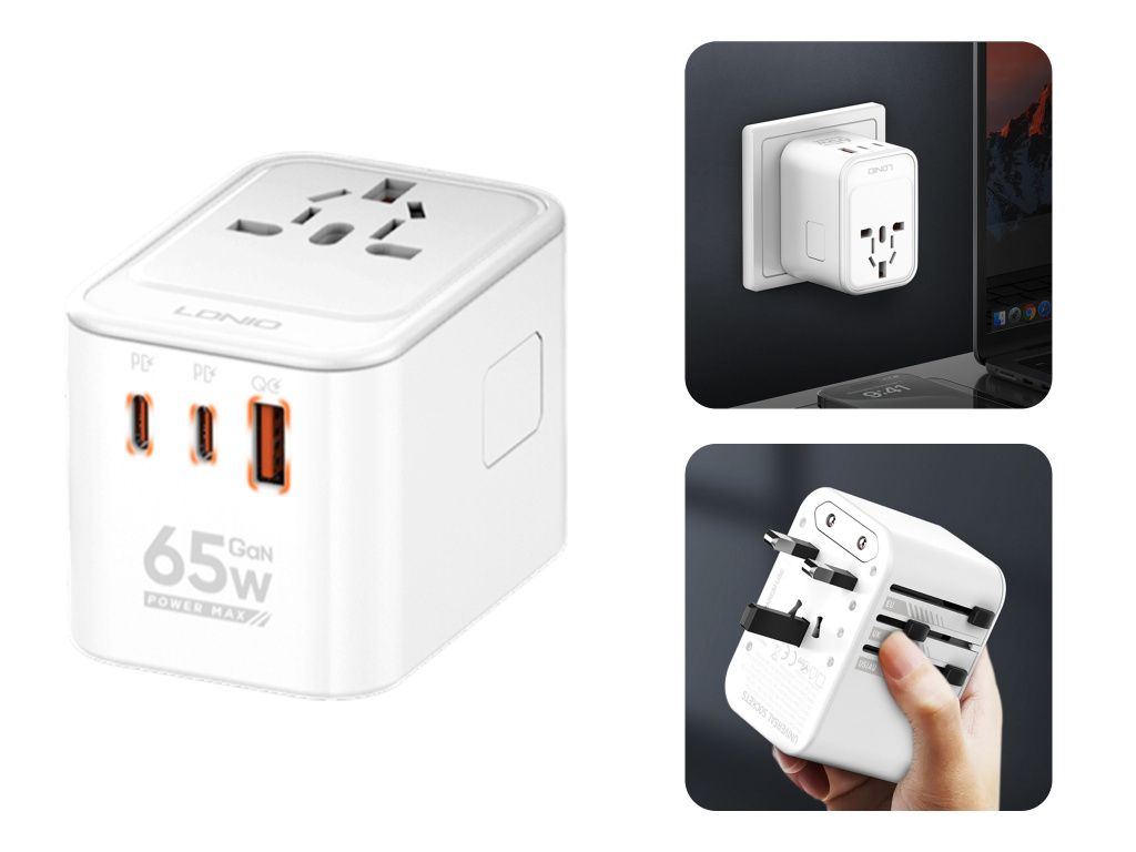 LDNIO Z6 65W GaN cestovní USB adaptér s 2× USB-C a 1× USB-A, rychlé nabíjení QC3.0, integrované zásuvky pro US/UK/EU, 9násobná ochrana a odolný ohnivzdorný design.