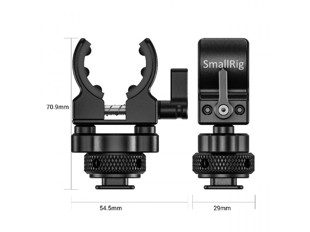 SmallRig držák Shotgun mikrofonů (Cold Shoe) BSM2352 slouží pro uchopení mikrofonu s průměrem od 19mm do 25mm. Vše jednoduše pomocí otáčení knoflíku. Na spodní straně má držák klasické sáňky (cold shoe) pro nasazení do Hot Shoe.